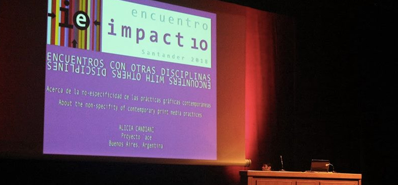 Alicia Candiani was the special Keynote Speaker and International Advisor in the IMPACT 10-Encuentro, the International Multidisciplinary Printmaking Conference that was celebrated in the city of Santander, Spain, from September 1 to 9, 2018. In her role of International Advisor Alicia worked during three years to build the conference international liaisons and to ensure, specially, the Latin American attendance. As keynote speaker she addresses one of the three main topics: “Encounter with other disciplines”. The lecture covered expanded media printmaking practices in the work of individual artists, in Alicia recent experiences as International Randall Chair in Expanded Media as well in the resident artists working in Proyecto´ace under her direction.