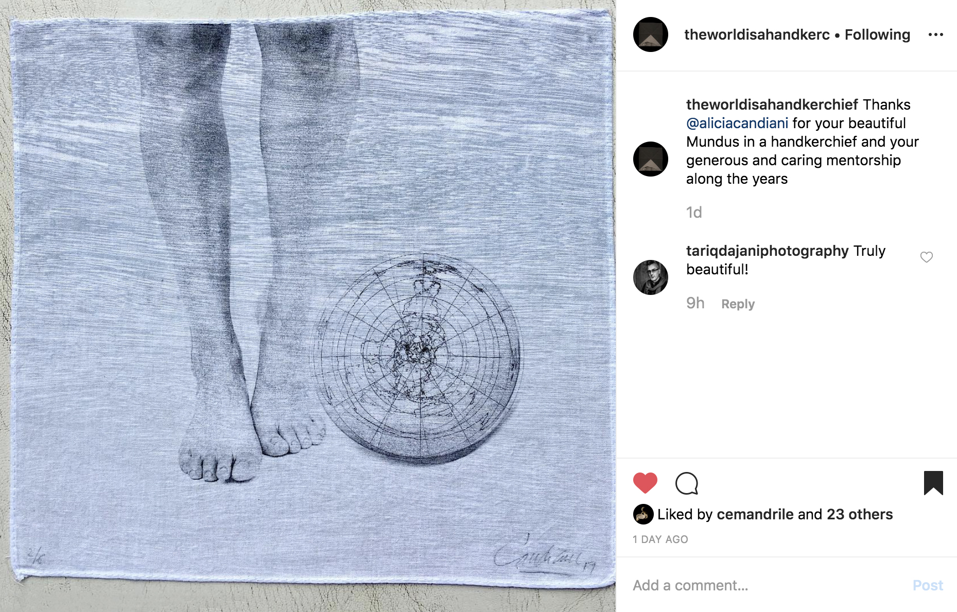 The growing handkerchiefs collection emerging from this project will be presented in each new venue that hosts the event, and continue as a traveling exhibition during 2020. Supported by an itinerant practice, this project will be documented and shared in Instagram (theworldisahandkerchief.)”