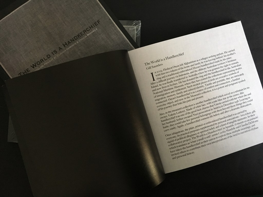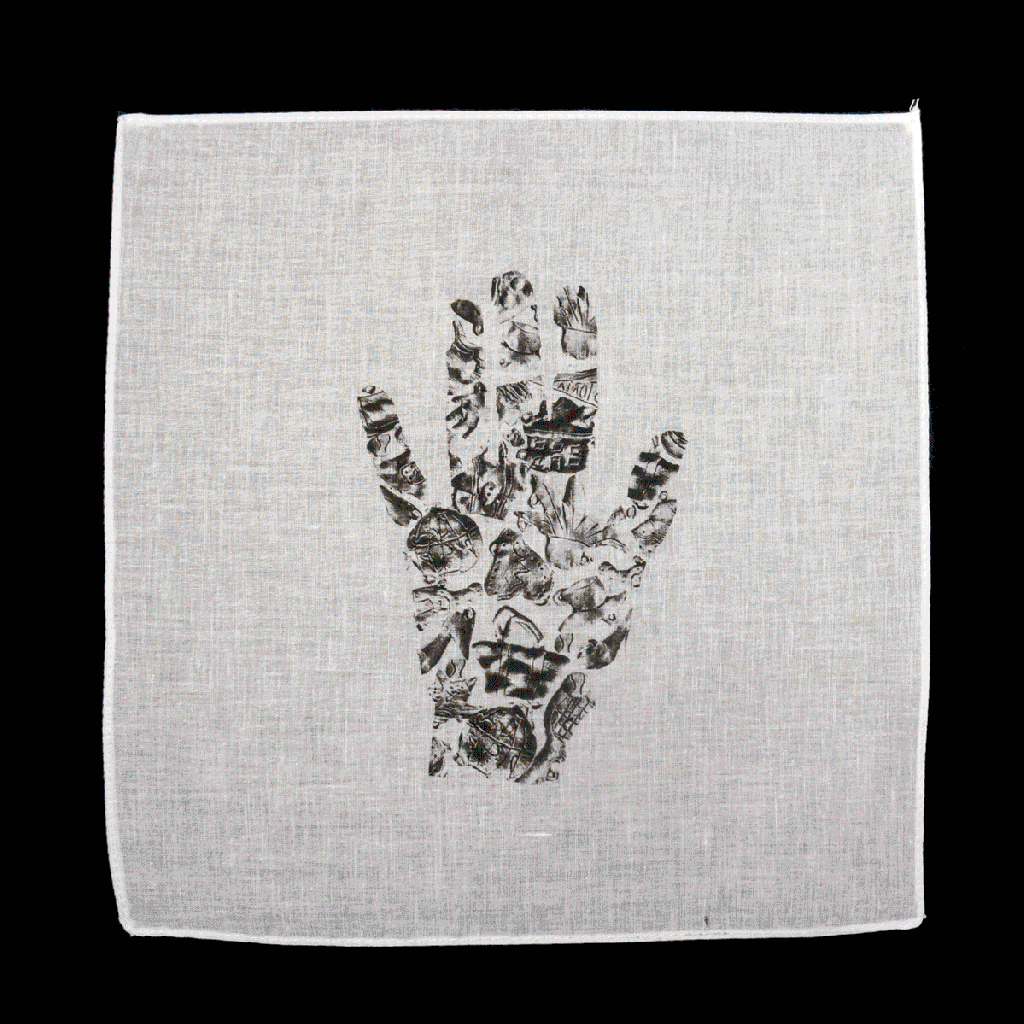 “The World is a Handkerchief” is an international collaborative project of 50 artists, featuring a collection of handkerchiefs which explores notions of homeland, family, displacement, and identity.